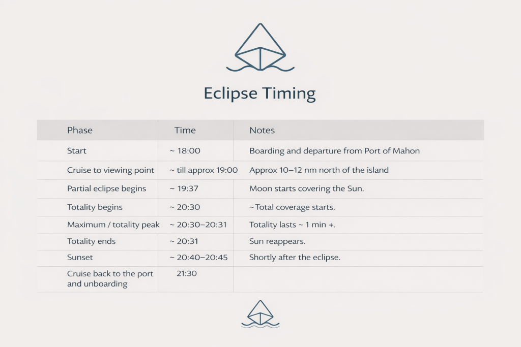 Boat Charter Menorca offers exclusive private yacht charters positioned within the optimal Path of Totality for the evening of the eclipse.